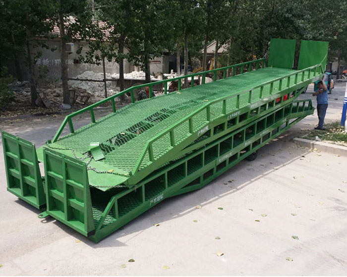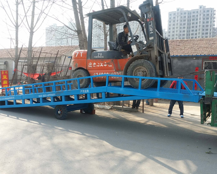 移動登車橋是與叉車配合使用的貨物裝卸輔助設備。有了它,叉車能直接從地面駛入汽車車廂內部進行批量裝卸作業。移動登車橋采用人工液壓動力,不需接動力電源,只需單人操作,可實現貨物的快速裝卸。它可使企業減少大量勞動力,成倍提高裝卸作業效率,加快貨物流通速度,獲取更大經濟效益。移動登車橋用于郵政、工廠等有站臺的倉庫、貨廠等大噸位批量裝車,具有效率高等特點。DCQ型為手搖變幅式,用手搖泵操作,不用電源就可使橋板實現變幅;廣泛用于無裝卸設備和裝卸貨臺的流動裝卸場所;是一種省時、省地、解決高位差作業的高效物流機械。
