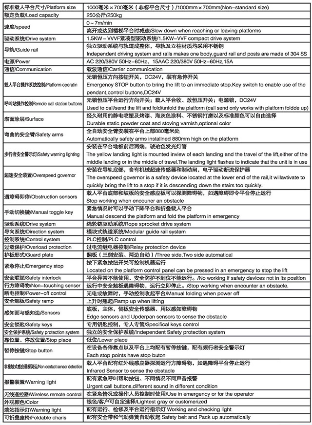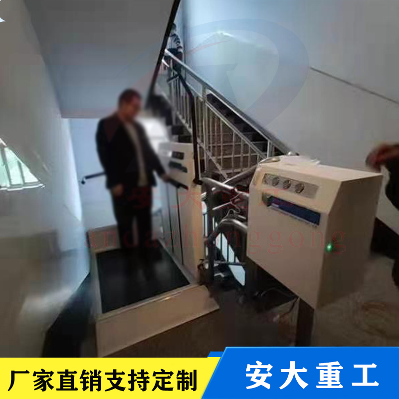 斜掛式無障礙升降平合按其運行方向分曲線型和直線型二種。直線型多采用齒輪齒條式驅動機構,沿樓梯做上升和下降,只能作直線運行不能轉彎,傾斜角一般不大于35度,適用于樓層較低、中間沒有水平段的直線型樓梯。曲線型采用繩球鏈式傳動,不僅能做上升和下降,還能水平、轉彎和螺旋形運行,適用范圍較為廣。該設備為乘坐輪椅的殘障人員上下樓梯提供了便利,現被廣乏地應用在家居住宅和公共場所的樓梯上